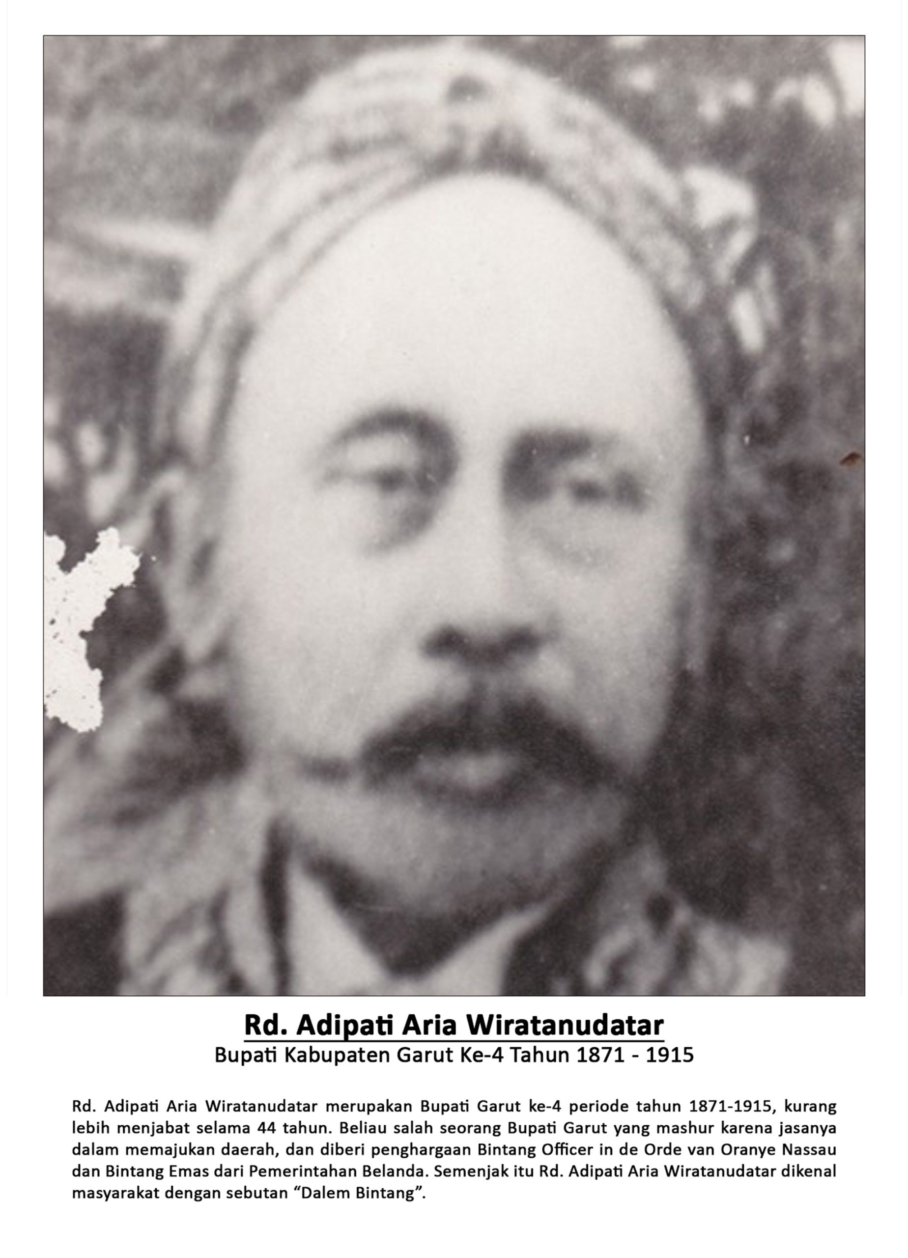 | Rd. Adipati Aria Wiratanudatar Bupati Kabupaten Garut Ke-4 Tahun 1871-1815 Rd. Adipati Aria Wiratanudatar merupakan Bupati Kabupaten Garut ke-4 periode tahun 1871-1915, kurang lebih menjabat selama 44 tahun. Beliau salah seorang Bupati Garut yang mashur karena jasanya dalam memajukan daerah, dan diberi penghargaan BintangOfficer in de Orde van Oranye Nassau dan Bintang Emas dari Pemerintahan Belanda. Semenjak itu Rd. Adipati Aria Wiratanudatar dikenal masyarakat dengan sebutan “Dalem Bintang” |